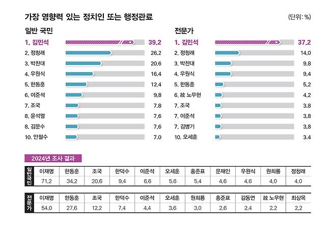 지난해 5위를 기록한 이준석 개혁신당 대표(9.8%)는 올해 6위를 기록했다. 7위에는 지난해 총선에서 '조국 돌풍'을 일으키며 3위를 기록했던 조국 전 조국혁신당 대표(7.8%)가 올랐다. 내란 수사의 중심에 선 윤석열 전 대통령(7.6%)과 국민의힘 차기 당권을 놓고 격돌 중인 김문수 전 고용노동부 장관(7.6%)은 공동 8위를 기록했다. 10위에는 안철수 국민의힘 의원(7.0%)이 올랐다.