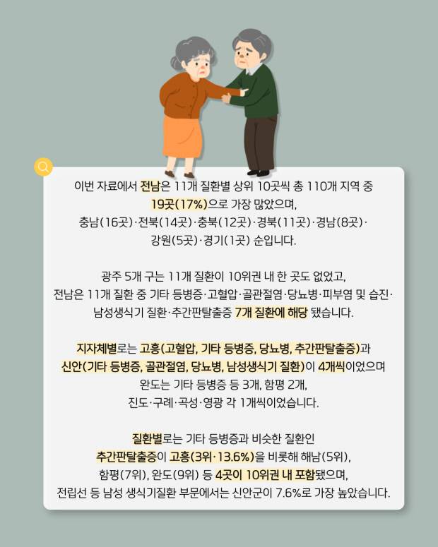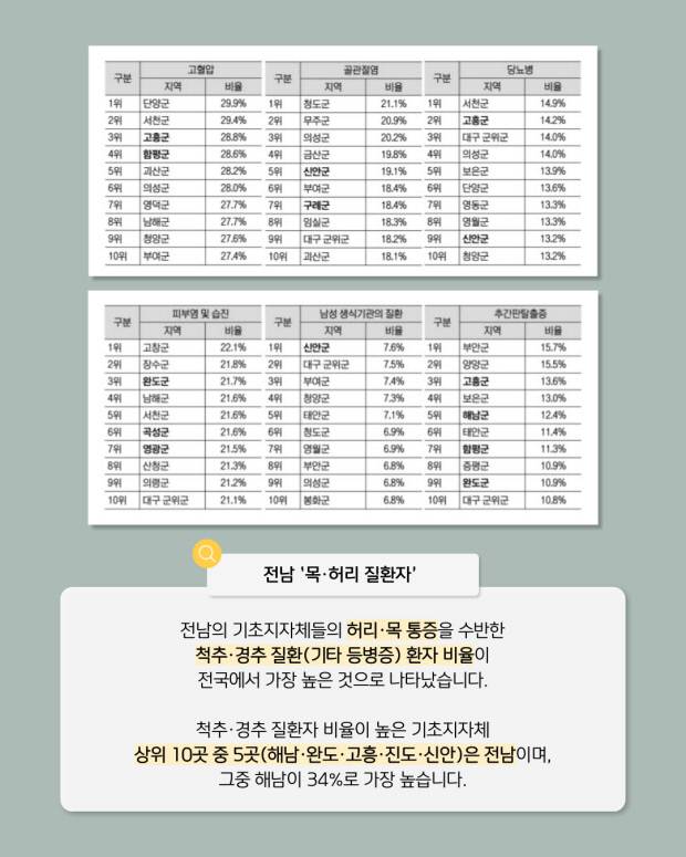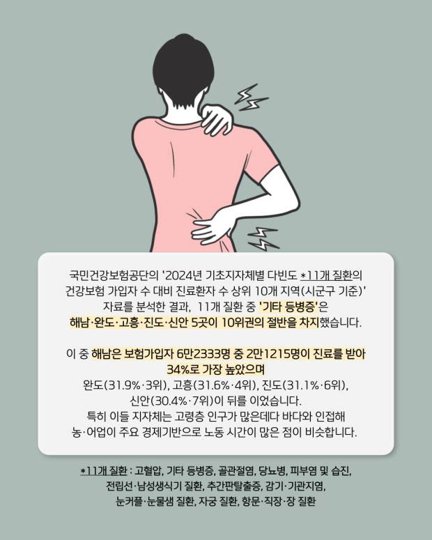 국민건강보험공단의 '2024년 기초지자체별 다빈도 11개 질환의 건강보험 가입자 수 대비 진료환자 수 상위 10개 지역(시군구 기준)' 자료를 분석한 결과, 전남 기초지자체들의 허리·목 통증을 수반한 척추·경추 질환(기타 등병증) 환자 비율이 전국에서 가장 높았습니다.