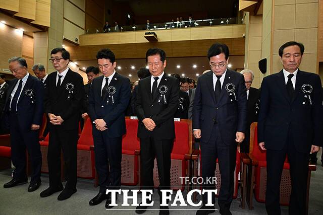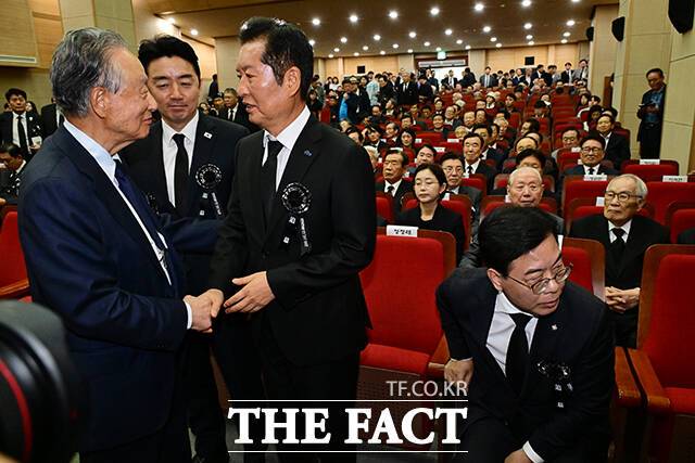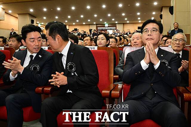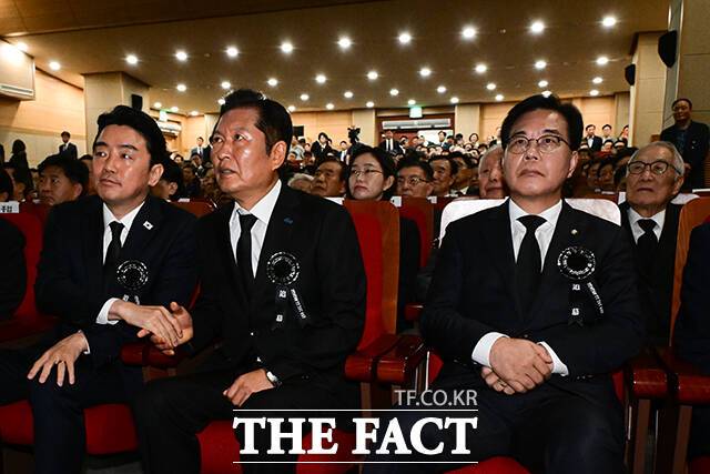 [더팩트ㅣ남윤호 기자] 정청래 더불어민주당 대표가 18일 서울 동작구 국립서울현충원 현충관에서 열린 '김대중 전 대통령 서거 16주기 추도식'에 참석해 강훈식 대통령 비서실장과 대화하고 있다. 오른쪽은 송언석 국민의힘 비상대책위원장 겸 원내대표.