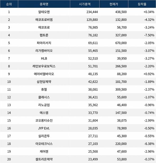 한국거래소에 따르면, 시가총액 1위 알테오젠(196170)은 현재가 438,500원으로 전 거래일 대비 0.34% 상승 중이다.