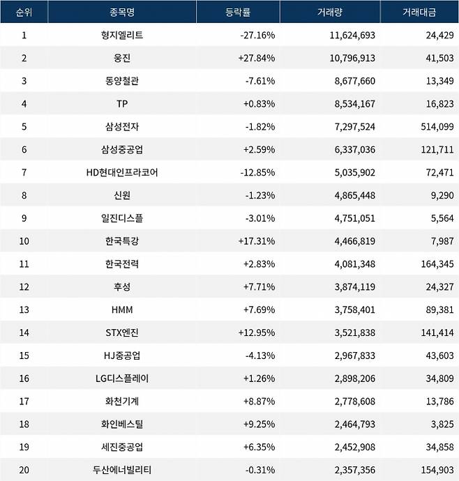 한편 거래량 상위 20위권 종목들은 한국전력(015760) ▲2.83%, 후성(093370) ▲7.71%, HMM(011200) ▲7.69%, STX엔진(077970) ▲12.95%, HJ중공업(097230) ▼4.13%, LG디스플레이(034220) ▲1.26%, 화천기계(010660) ▲8.87%, 화인베스틸(133820) ▲9.25%, 세진중공업(075580) ▲6.35%, 두산에너빌리티(034020) ▼0.31% 등의 성적을 기록했다.