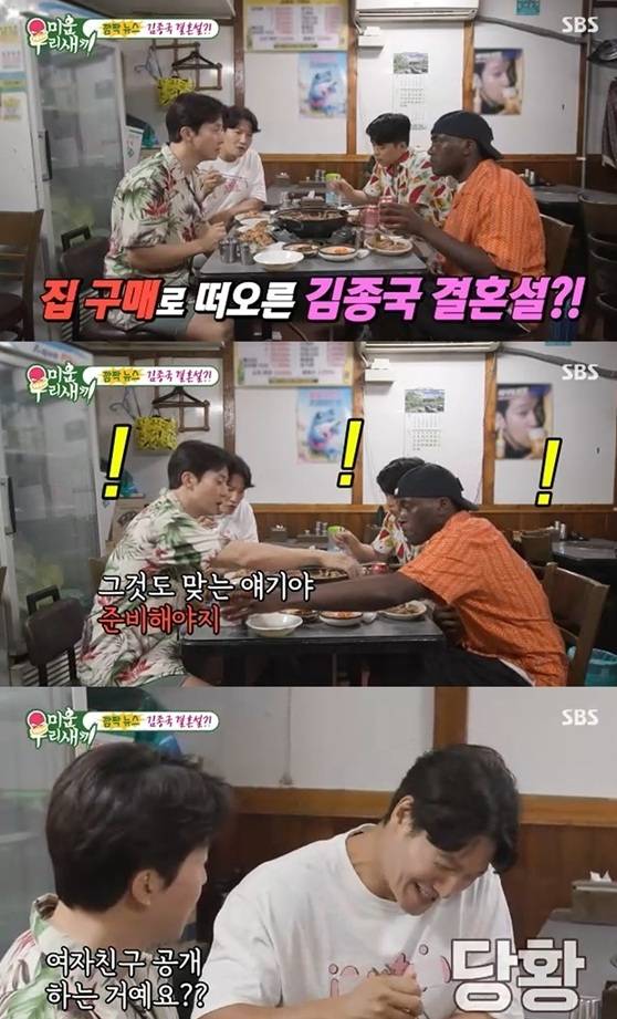 허경환이 "지금 여자친구 공개하는 거냐"며 당황해하자 김종국은 "그건 아니지만 준비를 해야 결혼하는 거 아니냐"라며 의미심장한 답변을 덧붙였다. 또한 "결혼 축하드린다"라는 허경환의 말에 김종국은 "하지 마라. 몰아가기 하지마"라고 손사레를 치기도 했다.