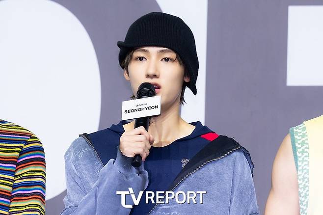 그룹 '코르티스' 성현이 18일 오후 서울 용산구 한남동 블루스퀘어에서 열린 첫 번째 미니 앨범 '컬러 아웃사이드 더 라인스(COLOR OUT THE LINES)' 발매 기념 쇼케이스에 참석해 소감을 말하고 있다.