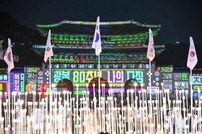 [포토] 광복 80주년 기념, 광화문 일대를 화려하게 물들인 '80개의 빛 하나된 우리' 빛축제