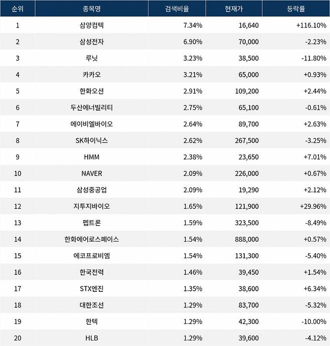 이어 검색비율 2위의 삼성전자(005930)는 하락률 2.23%로 하락 마감했다. 검색비율 3위의 루닛(328130)은 11.80% 급락 마감했다. 검색비율 4위 카카오(035720)는 0.93% 보합 마감했다. 검색비율 5위 한화오션(042660)은 2.44% 상승 마감했다.