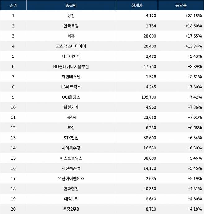 6위 HD현대에너지솔루션(322000)은 종가 47,750원으로 8.89% 상승 마감했다. 7위 화인베스틸(133820)은 종가 1,526원으로 8.61% 상승 마감했다. 8위 LS네트웍스(000680)는 종가 4,245원으로 7.60% 상승 마감했다. 9위 OCI홀딩스(010060)는 종가 105,700원으로 7.42% 상승 마감했다. 10위 화천기계(010660)는 종가 4,960원으로 7.36% 상승 마감했다.