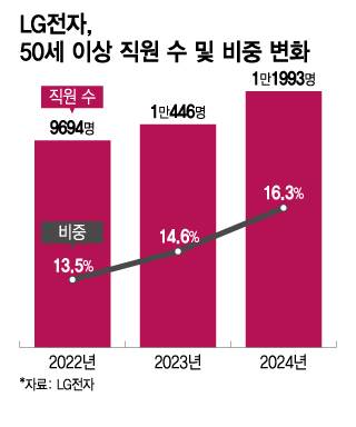 사업 부진과 함께 조직이 늙어가는 것도 문제다. LG전자에서 50세 이상의 직원은 1만1993명으로 전체 직원의 16.3%를 차지한다. 최근 2년 사이 50세 이상 직원은 23.7% 늘었으나 같은 기간 30~49세 직원의 수는 2.5% 감소해 인력 선순환 필요성이 커졌다. 삼성전자 역시 30대 미만 직원은 감소하는 반면 40대 이상은 증가하며 고령화 현상이 나타난다.