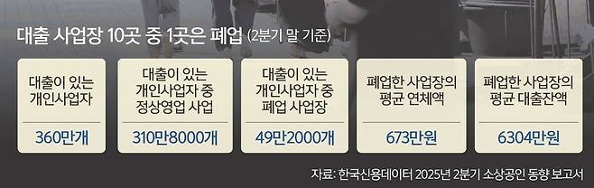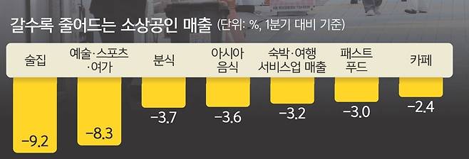 소비 위축이 이어지면서 2분기 술집 매출이 1년 전보다 10% 가까이 쪼그라들었다. 개인사업자 대출이 있는 사업장 중 49만여개는 폐업 상태였고, 이들의 빚은 평균 6304만원으로 조사돼 어느 때보다 소상공인들이 어려운 시기를 보내고 있는 것으로 나타났다. 특히 민생회복 소비쿠폰 사용률이 50%를 넘기면서 ‘소비쿠폰 보릿고개’를 걱정하는 소상공인들이 늘고 있다.