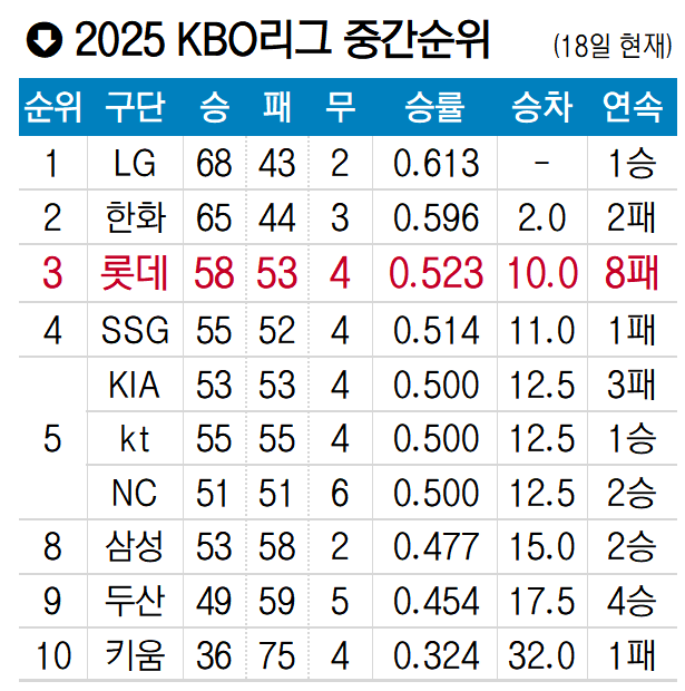 3위를 유지하고 있는 롯데는 18일 현재 4위 SSG와의 1경기 차, 공동 5위(KIA·kt·NC)와는 2.5 경기 차를 유지하고 있다. 롯데는 19~21일 선두 LG 트윈스와의 주중 3연전에 사활을 걸어야 한다. 9경기째 승리를 챙기지 못했지만, 연패의 사슬은 일단 차단했다. 김 감독은 “안 될 때는 빠질 타구가 잡히고, 잘 될 때는 빗맞아도 안타가 되는 게 야구”라고 답답함을 표시했다. 이제 롯데는 ‘잘 될 때의 롯데’로 돌아가야 한다.
