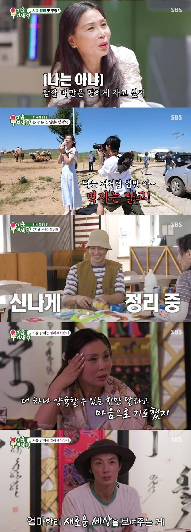 이날 ‘칼각 정리왕’ 윤시윤은 어머니와 몽골 여행을 떠났다. 긴 생머리에 동안 미모를 뽐내며 등장한 시윤 모친에 모벤져스는 “진짜 엄마냐? 극 중에서 만난 엄마 같다”라며 연신 감탄했다. 단촐한 어머니 짐과는 달리, 꼼꼼하게 짐을 챙긴 윤시윤에게 모친은 “방을 같이 쓰는 건 싫다. 잠잘 때만은 편하게 자고 싶다”라고 솔직한 속마음을 드러냈다. 이어 “너네 집에 다녀올 때마다 ‘저거 장가가기 힘들겠는데’ 생각한다”라고 덧붙여 폭소를 자아냈다.