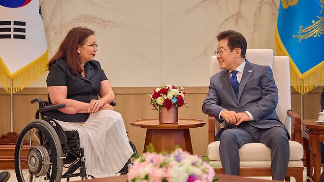 ▲ 이재명 대통령이 18일 서울 용산 대통령실 청사에서 태미 덕워스 미국 상원의원을 만나 대화하고 있다.