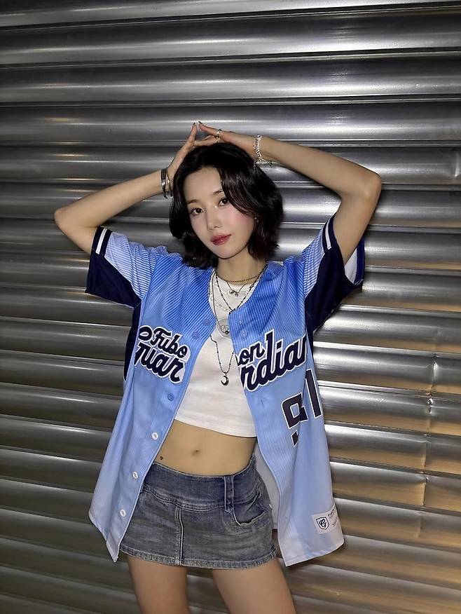 마지막 사진에서는 스포티한 무드가 드러났다. 블루 계열의 야구 점퍼를 걸치고 두 손을 머리 위로 올린 자신감 넘치는 포즈가 더해져 걸크러시 매력을 완성했다.