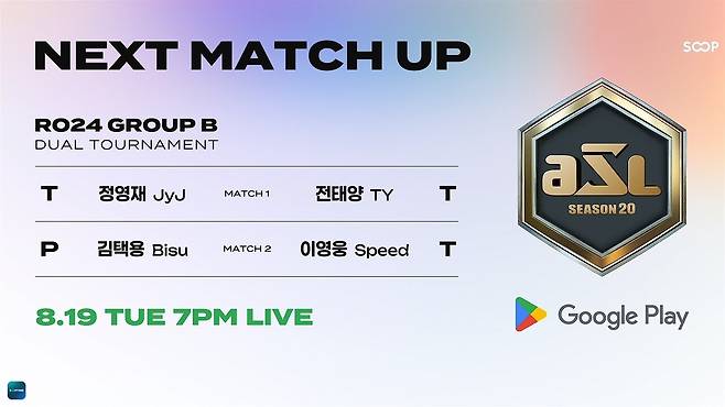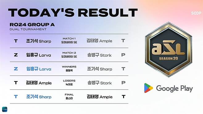 라이브 스트리밍 플랫폼 SOOP은 18일 스타크래프트 대회 'Google Play ASL 시즌 20' 24강을 개최했다. 24강 A조에는 홍구(임홍규), 조기석, 송병구, 김태영이 이름을 올렸다.