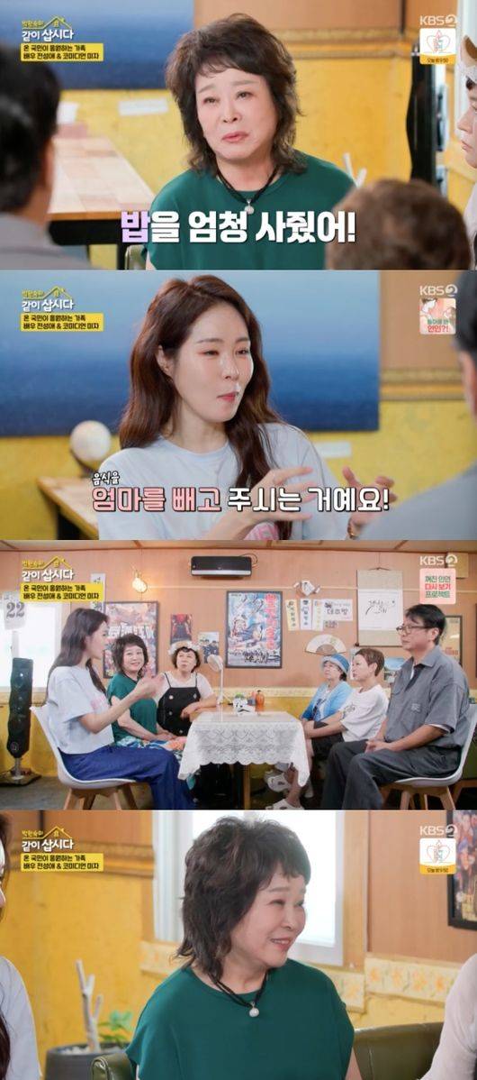 전성애는 박원숙이 밥을 많이 사줘서 더욱 고마웠다고 밝혔다. 이에 미자는 “되게 서러운 게 촬영장 가면 친한 분들만 계시지 않냐. 먹을 게 있으면 엄마를 빼고 주시는 것이다. 그런 게 가슴 아파서 집에 와서 울기도 하고”라며 당시 전성애의 고충을 토로했다.