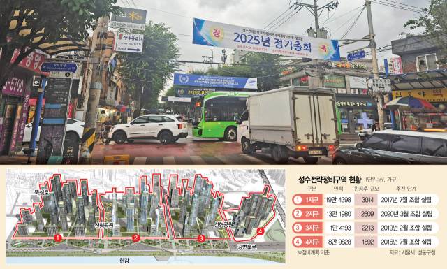 1차선 또는 2차선의 좁은 도로를 사이에 두고 밀집한 낡은 상가·주택들. 건물들 위로는 전신주를 통해 어지럽게 전깃줄이 이어져 있다. 서울 성동구 성수동 1·2가 성수전략정비구역 1~4지구의 모습이다. 이 같은 노후 주택가의 모습에도 1~4지구는 미래 가치가 기대되는 대표적인 지역으로 꼽힌다. 재개발 사업을 통해 한강·서울숲과 인접한 총 9400여 가구, 최고 50층 이상의 초고층 단지 조성이 예정돼 있기 때문이다.