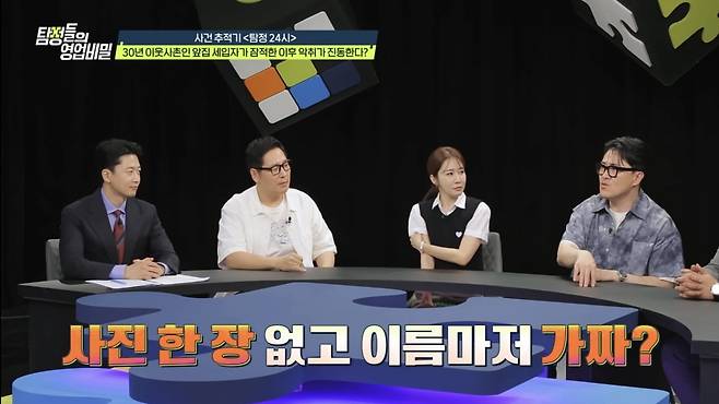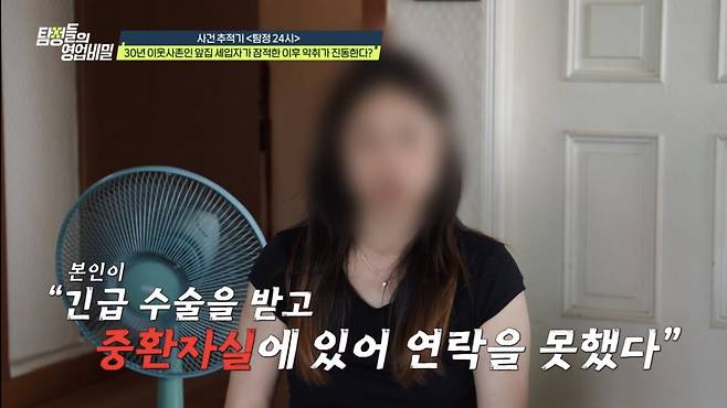 지난 18일 방송된 채널A '탐정들의 영업비밀' 속 '탐정 24시'에서는 "올해 5월부터 약 3개월 동안 눈, 코가 따가울 정도의 지독한 악취에 시달리고 있다"는 의뢰인이 등장했다. 현장을 찾았던 백호 탐정단은 악취에 대해 "음식물 쓰레기통의 몇 배로 심각한 수준"이라고 설명했다. 악취의 근원지인 앞집 세입자는 올해 2월 "연락 두절된 남편을 찾으러 서울에 간다"며 떠났다. 이후 세입자는 "제가 긴급 수술을 받고 중환자실에 있다"는 연락을 끝으로 행방이 묘연한 상태였다. 그리고 6월경, 의뢰인의 딸이 세입자와 어렵게 전화 연결에 성공했지만 "아무런 대답 없이 개 짖는 소리만 났다"고 전해 의문을 더했다. 더욱 이상한 점은, 의뢰인이 30년 동안 알던 세입자의 이름이 가짜였다는 것이다. 또 이 세입자는 사진 찍는 것을 극도로 싫어해 단 한 장의 사진도 남기지 않은 것으로 드러났다.