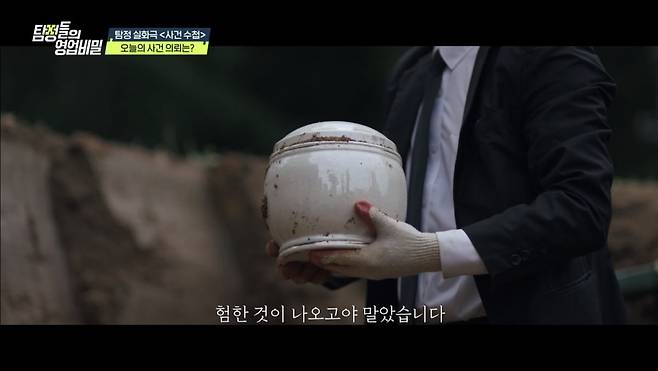 '구마적' 배우 이원종이 일일 탐정으로 함께한 탐정 실화극 '사건 수첩'에서는 "아버지의 묘에 모르는 유골함이 묻혀있었다"는 의뢰가 접수됐다. 탐정단의 수소문 끝에 잡힌 파묘의 범인은 자신이 의뢰인 아버지의 혼외자라며 "죽어서라도 아버지 곁에 묻히고 싶다는 어머니의 마지막 소원을 들어주고 싶었다"고 주장했다. 그런데 탐정단에게 범인이 의뢰인의 아내와 함께 있는 모습이 포착돼 두 사람의 관계에 대한 의구심이 더해졌다. 이에 대해 김풍이 "의뢰인의 아내가 '전문 첩장 브로커' 아니냐"고 의문을 제기하자, 데프콘은 "진짜라면 세상 살맛이 안 나는데요?"라며 경악했다.