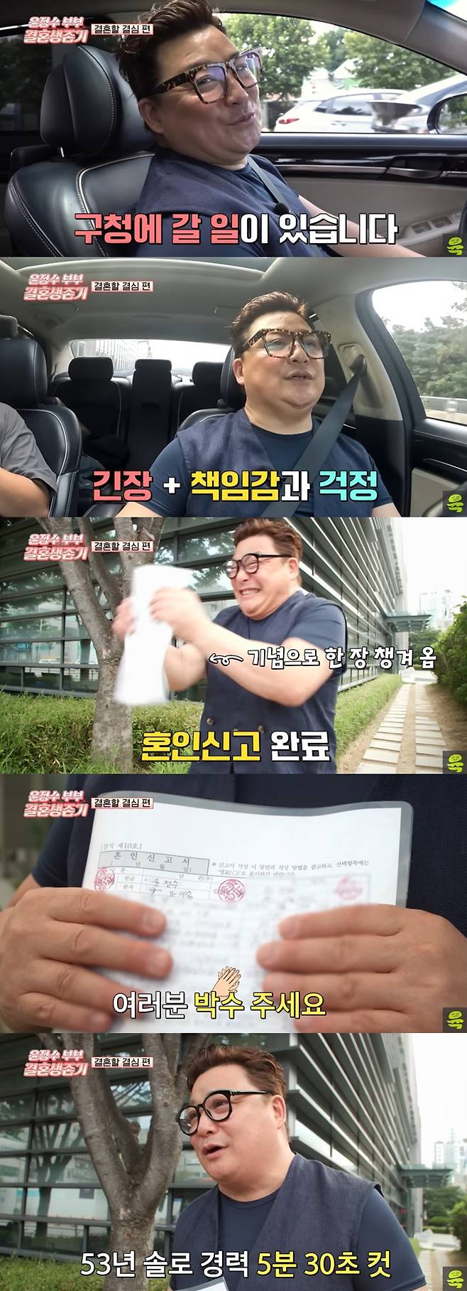 혼인신고를 마치고 혼인신고서를 공개한 윤정수는 제작진의 박수를 받았다. 그는 "이거 너무 금방 끝난다. 53년을 혼자 살아왔는데 서류 쓰니 5분 30초도 안 걸리더라"며 허무함을 고백했다.