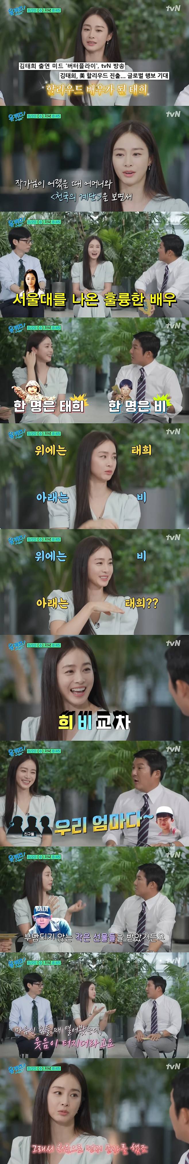 할리우드 데뷔작 '버터플라이' 작가에게 먼저 연락을 받았다는 김태희는 "작가님 어머님께서 '천국의 계단'을 보여주면서 '이 배우는 서울대를 나온 훌륭한 배우다'고 하셨다더라"며 "함께하자는 대답을 받았다"며 비하인드를 공개했다.