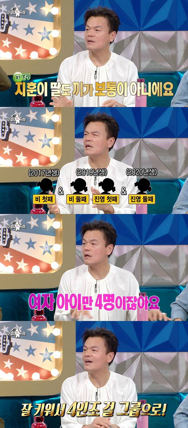 당시 박진영은 '비와 합작으로 걸그룹 결성 예정'이라는 질문에 "지훈이(비) 딸도 끼가 보통 끼가 아니다"며 "나도 딸 둘이다. 여자 아이만 4명이다. 잘 키워서 한번 4인조 걸그룹 만들고 싶다"고 밝혀 눈길을 끌었다.