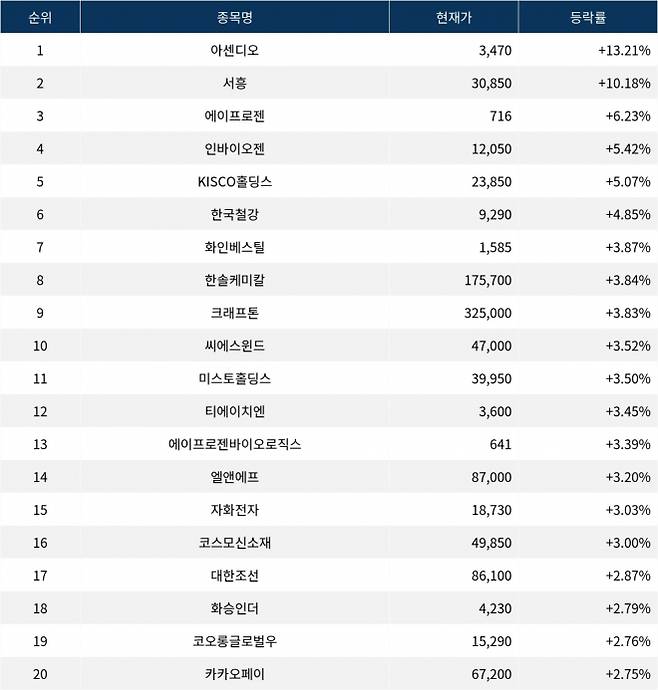 6위 한국철강(104700)은 현재가 9,290원으로 4.85% 상승 중이다. 7위 화인베스틸(133820)은 현재가 1,585원으로 3.87% 상승 중이다. 8위 한솔케미칼(014680)은 현재가 175,700원으로 3.84% 상승 중이다. 9위 크래프톤(259960)은 현재가 325,000원으로 3.83% 상승 중이다. 10위 씨에스윈드(112610)는 현재가 47,000원으로 3.52% 상승 중이다.