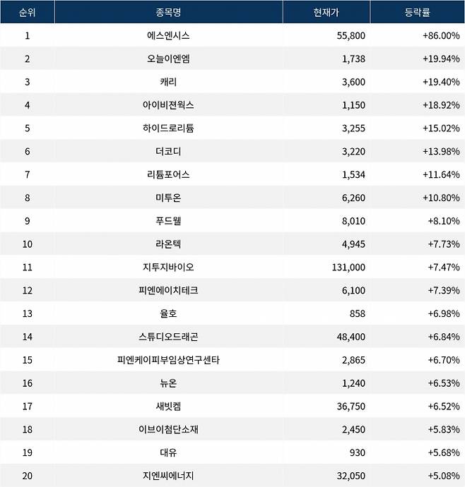이어 상승률 2위 오늘이엔엠(192410)은 현재가 1,738원으로 주가가 19.94% 급등하고 있다. 상승률 3위 캐리(313760)는 현재 3,600원으로 19.40% 급등하며 주목받고 있다. 상승률 4위 아이비젼웍스(469750)는 18.92% 급등하며 1,150원에 거래되고 있다. 상승률 5위 하이드로리튬(101670)은 15.02%의 상승세를 타고 3,255원에 거래되고 있다.