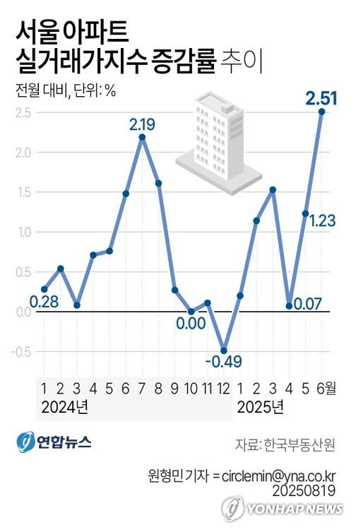 (서울=연합뉴스) 원형민 기자 = 19일 한국부동산원이 발표한 공동주택 실거래가지수에 따르면 지난 6월 서울 아파트 실거래가지수는 2.51% 오른 것으로 조사됐다.