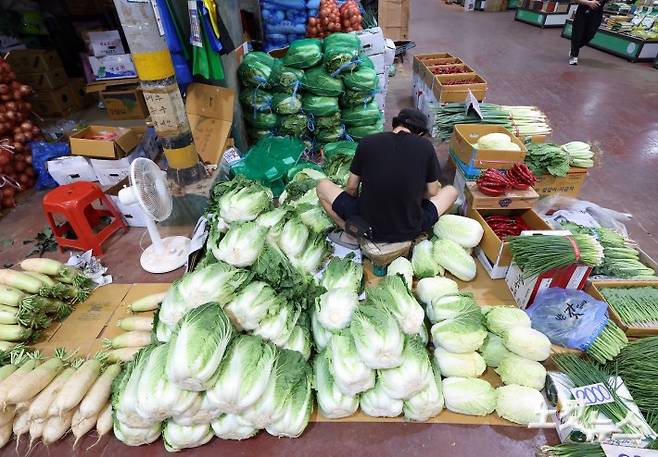 폭염과 폭우가 겹치면서 배춧값이 7000원을 돌파했다. 19일 한국농수산식품유통공사 집계에 따르면 어제(18일) 배추 상품 평균 소매가격은 7,062원으로, 전년보다 9.3% 상승했다. 이는 평년보다 11% 높은 수준이다. 불과 지난달까지만 해도 4000원대였던 배춧값은 지난 13일 6871원에 이어 14일 7023원으로 뛰더니 나흘 만에 다시 올랐다. 전달 대비 상승률은 52%로, 한 포기에 2500원 가까이 오른 셈이다. 사진은 19일 서울시내 한 전통시장에서 판매 중인 배추 모습.