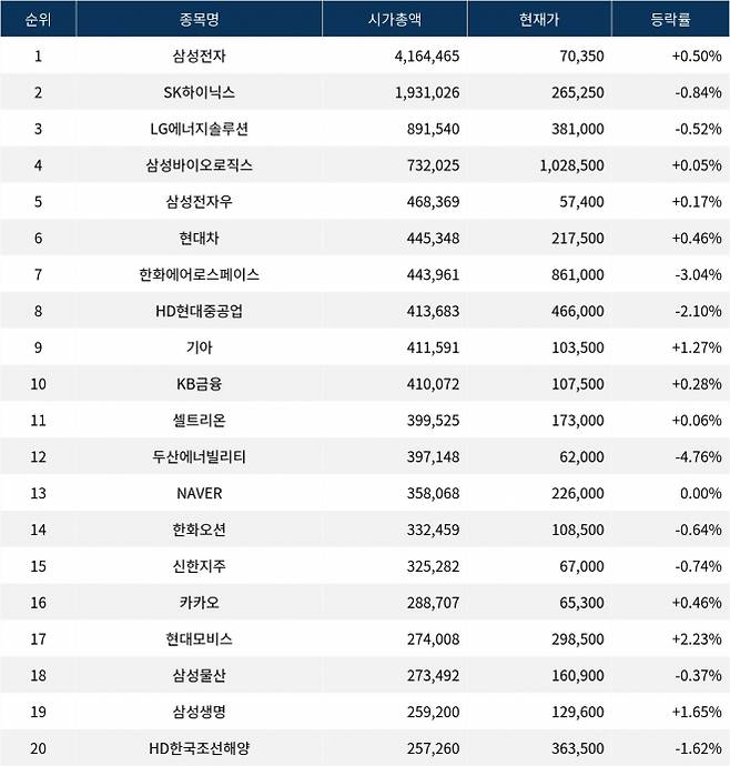 한편 시가총액 20위권 종목들은 셀트리온(068270) ▲0.06%, 두산에너빌리티(034020) ▼4.76%, NAVER(035420) 0.00%, 한화오션(042660) ▼0.64%, 신한지주(055550) ▼0.74%, 카카오(035720) ▲0.46%, 현대모비스(012330) ▲2.23%, 삼성물산(028260) ▼0.37%, 삼성생명(032830) ▲1.65%, HD한국조선해양(009540) ▼1.62% 등의 성적을 기록하고 있다.