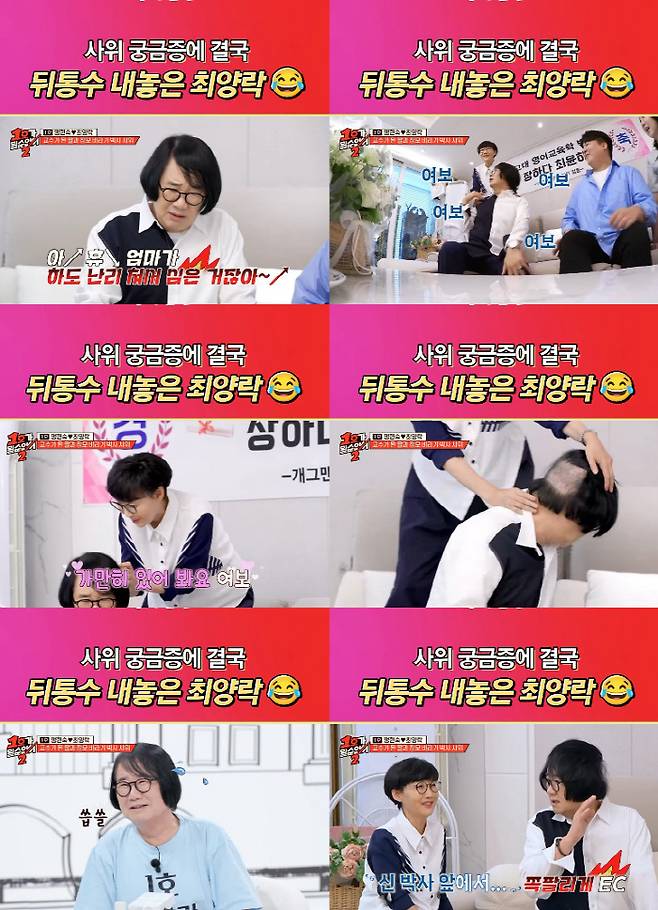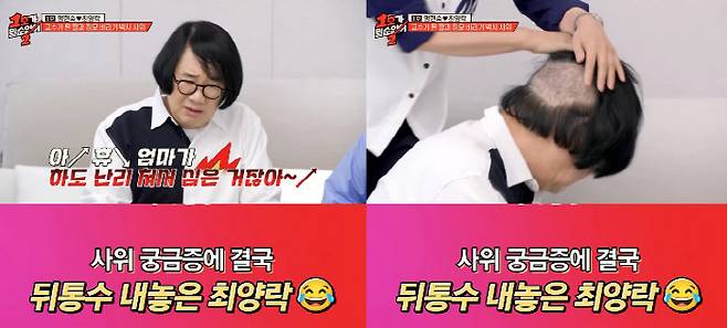 당황한 최양락은 공개를 거부한 채 연신 "여보"를 외치며 말렸지만, 팽현숙은 "가만히 있어봐라"며 결국 최양락의 뒤통수를 강제 공개했다.