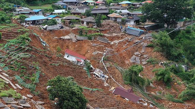 쓸려 내려간 주택은 토사에 파묻히거나 무너졌고, 나머지 주택은 금이 가거나 완전히 기울어 사람이 살기 어려워졌습니다.