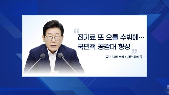이재명 대통령은 지난 14일 수석 비서관 회의에서 “전기료가 또 오를 수밖에 없을 것”이라며 “국민적 공감대를 형성해야 한다”라고 언급했습니다.