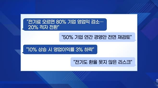 여러 경제 단체들의 설문 조사 결과에 따르면 전기 요금이 오르면 기업 80%의 영업이익이 내려가고 이 가운데 20%는 적자 전환하는 것으로 나타났습니다.