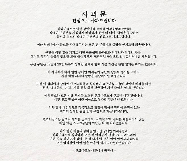 한화는 19일 박종태 대표이사 명의로 사과문을 내고 "한화는 이번 장애인석 특화석 변경운영과 관련해 장애인 여러분을 세심하게 배려하지 못한 데 대해 책임을 통감하며 불편을 겪으신 장애인 여러분께 진심으로 사과드린다"고 했다.
