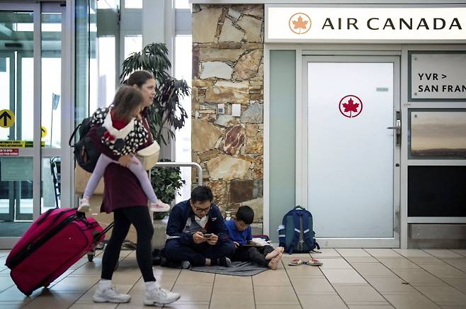 [에어캐나다 파업이 시작된 지난 16일(현지시간) 캐나다 밴쿠버국제공항에서 승객들이 대기하고 있다. (The Canadian Press via AP=연합뉴스 자료사진)]