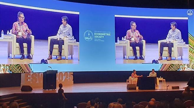 ▲ 제임스 로빈슨 미국 시카고대 교수가 19일 오후 서울 강남구 코엑스에서 열린 세계경제학자대회에서 기조강연을 하고 있다.