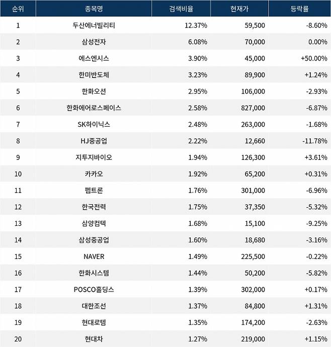 이어 검색비율 2위의 삼성전자(005930)는 보합으로 마감했다. 검색비율 3위의 에스엔시스(0008Z0)는 50.00% 급등세로 거래를 마쳤다. 검색비율 4위 한미반도체(042700)는 1.24% 상승 마감했다. 검색비율 5위 한화오션(042660)은 2.93% 하락했다.