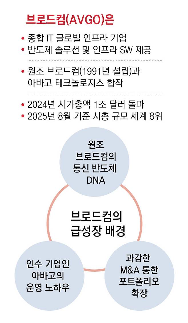 브로드컴은 2024년 시가총액 1조 달러를 돌파했고, 2025년 8월 기준 미 6개 빅테크와 사우디아라비아 아람코에 이어 세계에서 8번째로 큰 기업이 됐다. 현재 브로드컴은 원조 브로드컴의 통신 반도체 DNA, 아바고의 정밀한 운영 노하우, 탄의 과감한 M&A 전략이 결합돼 AI 시대에 최적화된 인프라 기업으로 완성됐다.