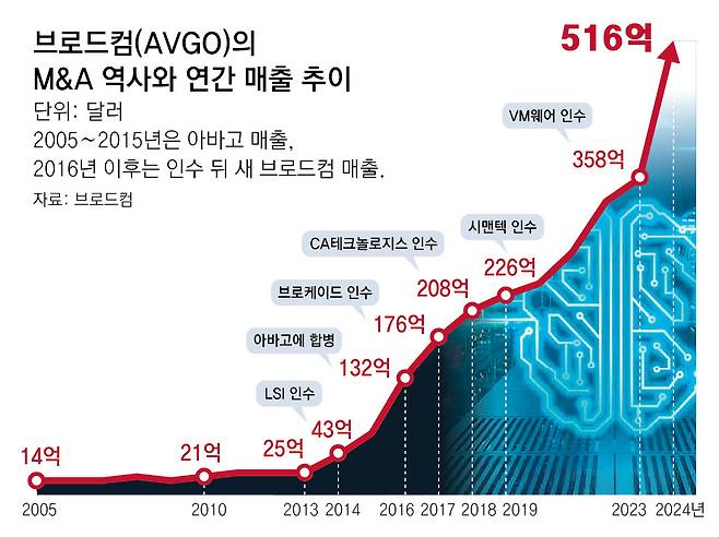 원조 브로드컴은 1991년 헨리 새뮤얼리 미 로스앤젤레스 캘리포니아대(UCLA) 교수와 제자 헨리 니컬러스 3세가 창업한 통신용 반도체 회사로 시작됐다. 1998년 기업공개(IPO) 당시 직원 320명의 작은 회사였다. 하지만 인터넷 붐과 함께 팽창하며 2000년 전후 공격적인 인수합병(M&A)을 통해 종합 통신 반도체 기업으로 발전했다. 그러나 2016년 아바고에 370억 달러(현 환율 기준 약 51조4300억 원)에 인수되며 25년 역사의 막을 내렸다.