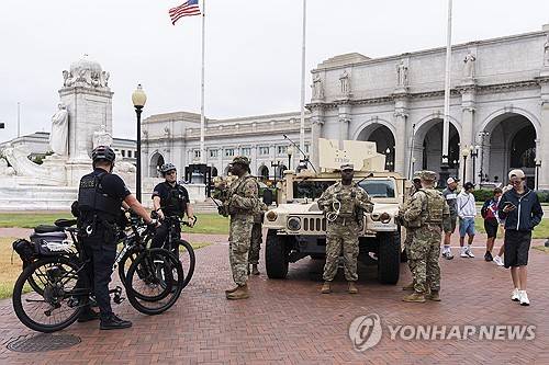 U.S. Capitol Police officers on bike patrol talk to District of Columbia Army National Guardsmen standing next to their Humvee military utility vehicle, outside Union Station near the U.S. Capitol in Washington, Tuesday, Aug. 19, 2025. (AP Photo/Manuel Balce Ceneta)