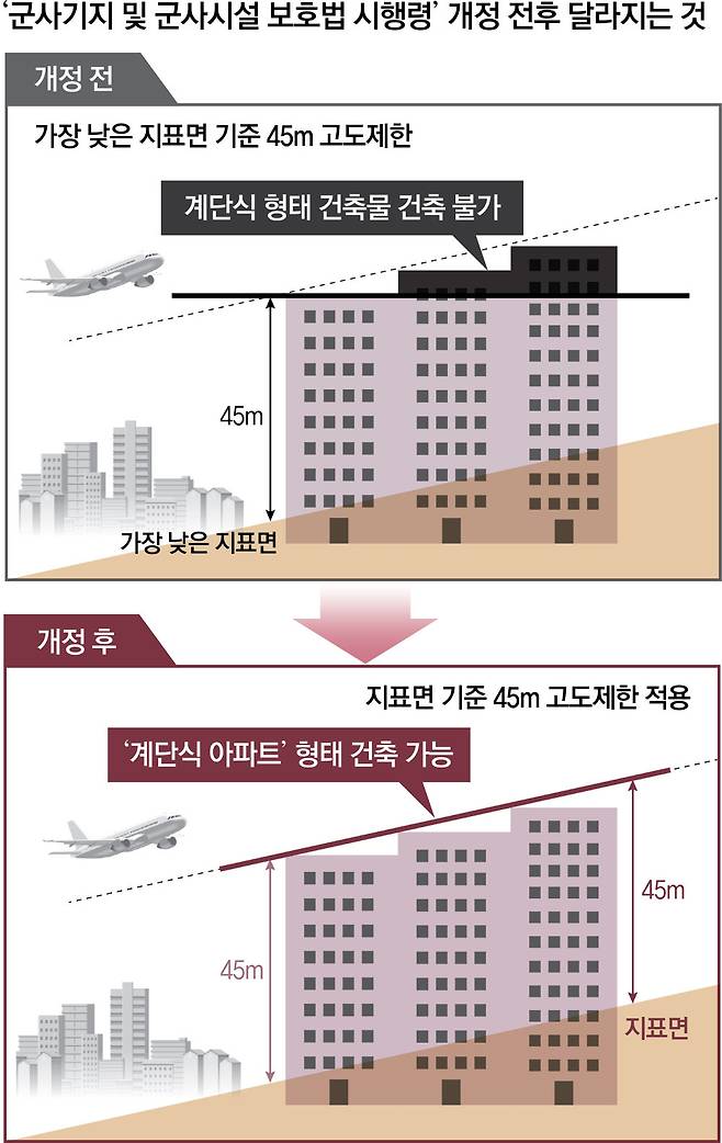시행령 개전 전에는 경사지에서 아파트 등 건축물을 건축할 때 ‘가장 낮은 부분의 지표면’ 기준에 걸려 경사지 윗부분 대지에선 건물을 낮게 지어야 하는 문제가 발생했다. 경사 지형이라도 개별 건축물을 건축하는 경우엔 시행령 개정 전에도 ‘가장 낮은 부분 지표면’ 기준이 적용되지 않아 별다른 제약이 없었다. 하지만 건축비를 절감해 재개발 사업성을 높이기 위해 건물 여러 동이 이어지도록 하는 방식으로 건축하는 경우엔 이 규정이 적용돼 계단식 형태 건축이 불가능했다. 이에 정비사업이 과도하게 제약되는 한편으로 국민 재산권도 침해한다는 지적이 이어져온 것. 국방부는 “군 작전활동 및 비행 안전에 미치는 영향 없이 경사지 등에서의 불합리한 규제를 해소하고 국민 재산권을 실질적으로 보장할 수 있다”고 개정 취지를 밝혔다.