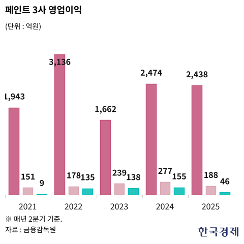 20일 금융감독원 전자공시시스템에 따르면 KCC의 올 상반기 연결 기준 매출과 영업이익은 3조3045억원, 2438억 원으로 각각 1.8%, 1.4% 감소하며 사실상 전년 동기 수준을 유지했다. 같은 기간 노루페인트는 매출(3965억원)이 소폭 감소(-1.4%)하며 선방했다. 하지만 고환율에 따른 원자재 가격 부담으로 영업이익이 32%나 줄었다. 삼화페인트도 매출(3107억원)은 3.8% 감소에 그쳤으나 영업이익은 3분의 1로 급감하며 수익성 악화를 면치 못했다.