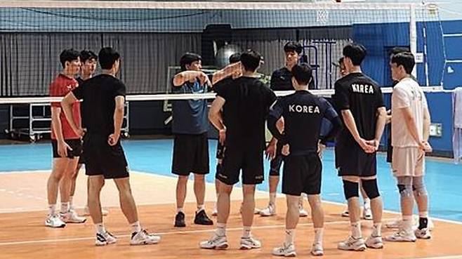 ▲ 석진욱 감독(중앙)의 설명을 듣는 U-21 남자배구 대표팀 선수들