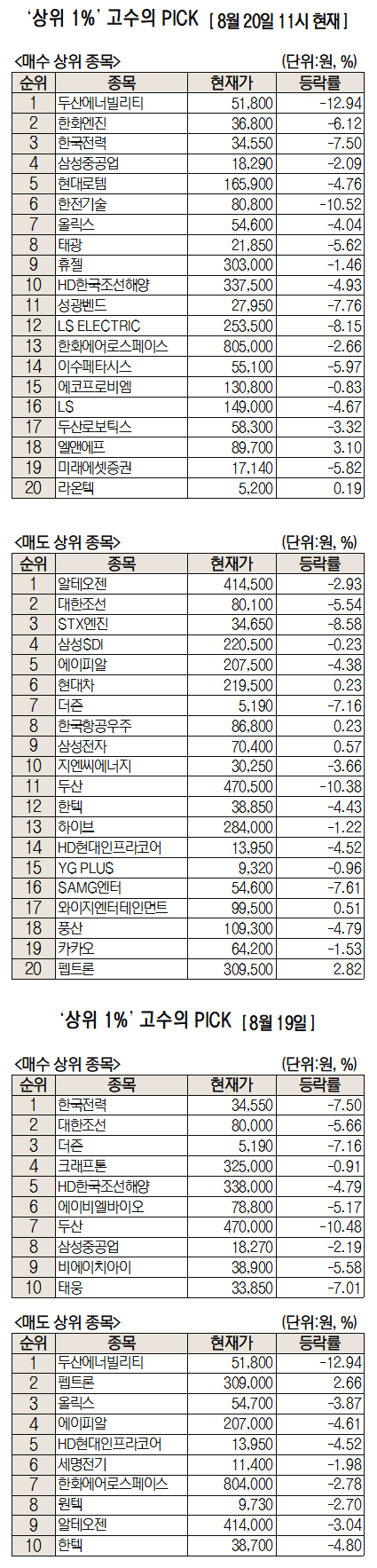이날 미래에셋증권에 따르면 미래에셋증권 주식 거래 고객 중 최근 1개월 동안 투자수익률 상위 1%에 해당하는 '주식 초고수'들이 오전 11시까지 가장 많이 사들인 종목은 두산에너빌리티다.