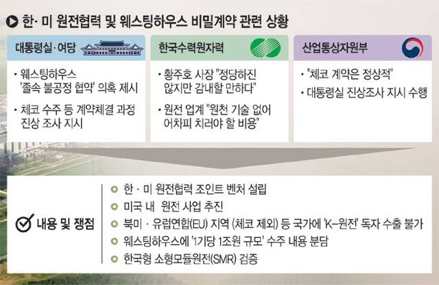 한편 논란이 불거지자 원전 수출 활성화를 기대하던 국내 원전 업계도 불확실성에 위기감을 느끼고 있다. 원전 업계 관계자는 “당장 체코에서 수주한 두코바니 신규 원전 수주에서 이상 조짐은 없지만 언제 또 돌발변수가 발생할지 예상하기 어렵다”며 “새 정부 출범 후 아직 명확한 원전 수출 관련 정책이 나오지 않은 상황에서 이번 논란은 큰 악재”라고 전했다. 또 다른 관계자는 “원전 사업을 수행하는 기업들 입장에서는 사업 계획을 추진하는 과정에서 정책 변화 가능성이 생긴 만큼 난감하다”며 “정부의 정책, 정치권의 동향 등을 면밀히 지켜보고 있다”고 말했다.