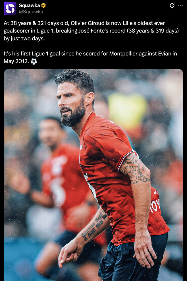 축구 통계 매체 '스쿼카'는 "38세 321일. 지루가 주제 폰트(41카사 피아)의 38세 319일 기록을 제치고 LOSC 릴 역대 최고령 득점자가 됐다"라며 "브레스트전 지루의 득점은 2012년 5월 이후 그가 리그1에서 처음으로 넣은 득점이기도 하다"라고 알렸다.