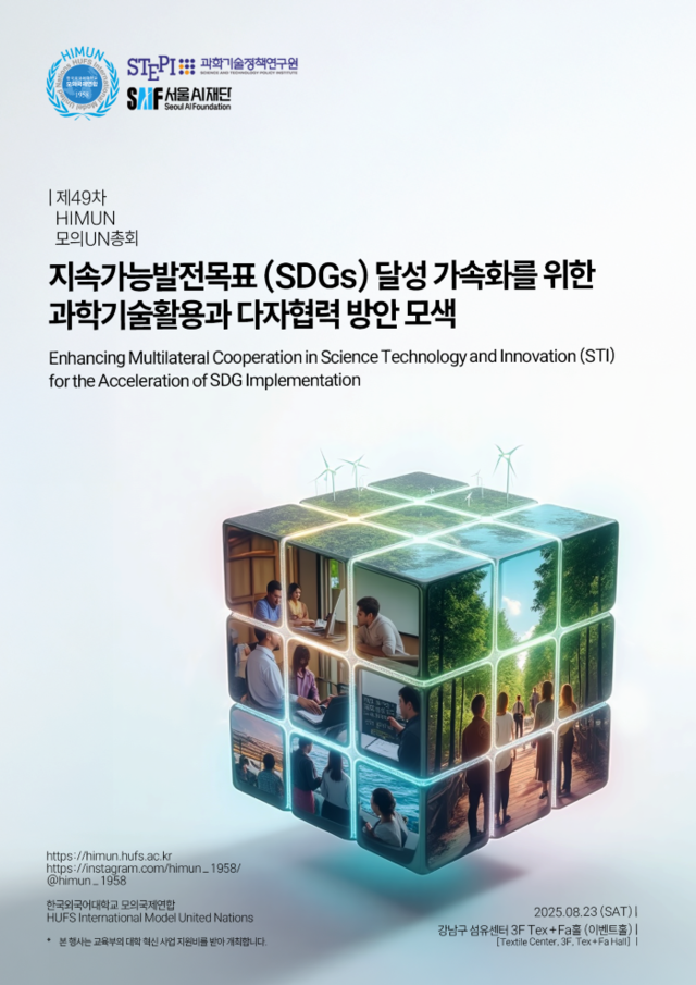 한국외국어대학교(총장 박정운) 모의국제연합(HUFS International Model United Nations, 이하 HIMUN, 하이문)은 과학기술정책연구원(STEPI), 서울AI재단(SAIF)과 공동으로 오는 23일 서울 강남구 섬유센터에서 ‘지속가능발전목표(SDGs) 달성 가속화를 위한 과학기술 활용과 다자협력 방안 모색’을 의제로 제49차 모의유엔총회를 개최한다. 이번 총회는 일반인에게 무료로 공개되며, 현장 참관이 가능하다.