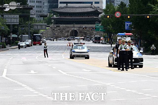 [더팩트ㅣ남용희 기자] 을지연습과 연계한 전국 민방위 훈련이 실시된 20일 오후 서울 종로구 세종대로 일대에서 소방차 길터주기 훈련이 진행되고 있다.