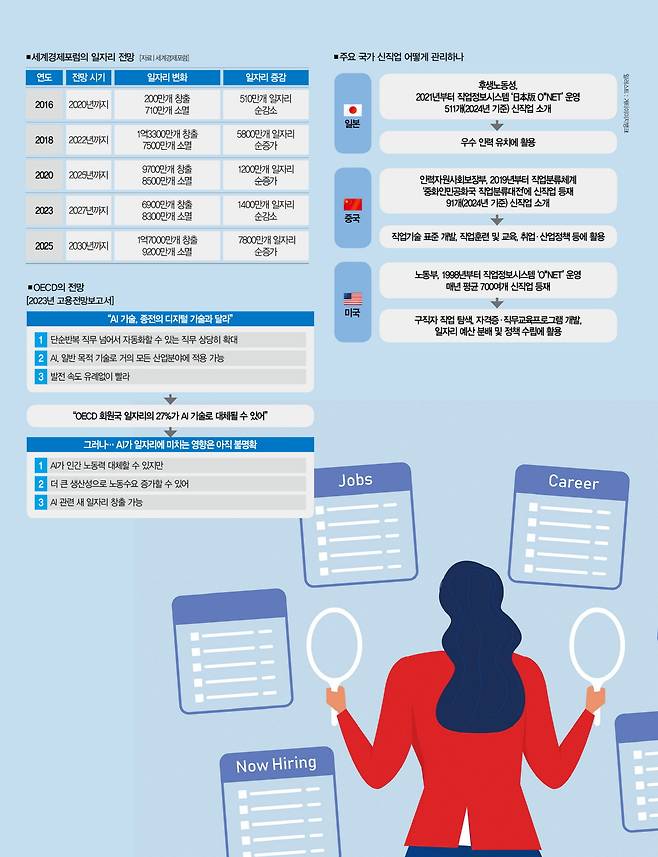 사실 우리나라가 다소 늦은 측면이 있다. 미국·일본·중국 등 세계 각국은 정책적으로 신산업을 육성할 뿐만 아니라 미래를 선도할 핵심 신직업 정보를 국가 차원에서 제공하고 있다. 일례로 미국 노동부는 1998년부터 직업정보시스템 'O*NET'을 운영하고 있는데, 매년(2003~2024년) 평균 700여개의 신직업을 등재하고 있다. 올해 들어 5월까지 714개의 신직업을 업데이트했을 정도다.