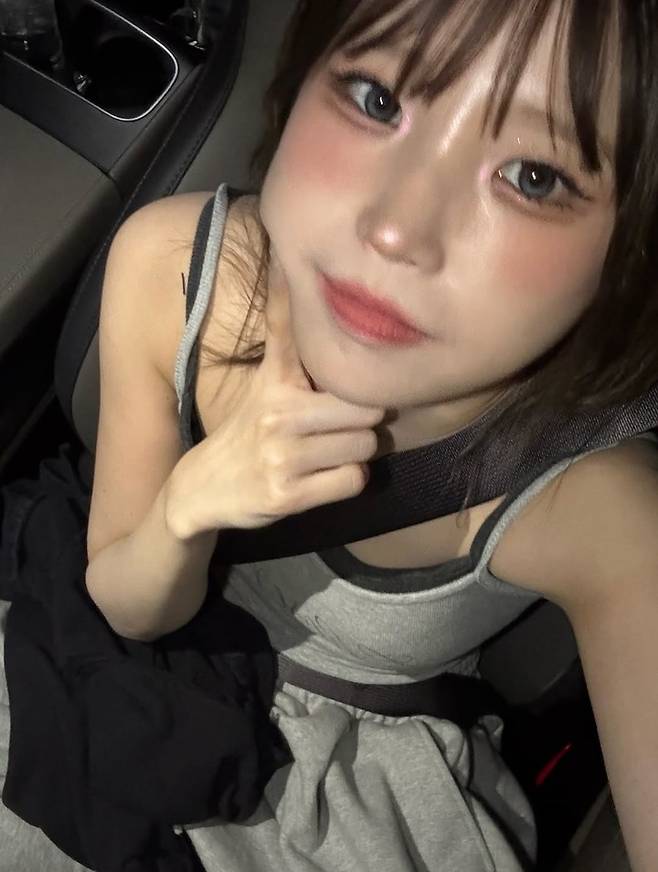 회색 슬리브리스 톱에 차콜 컬러 이너를 매치해 캐주얼하면서도 편안한 룩을 선보였다. 심플한 디자인 속에서도 자유롭고 사랑스러운 매력이 드러난다.